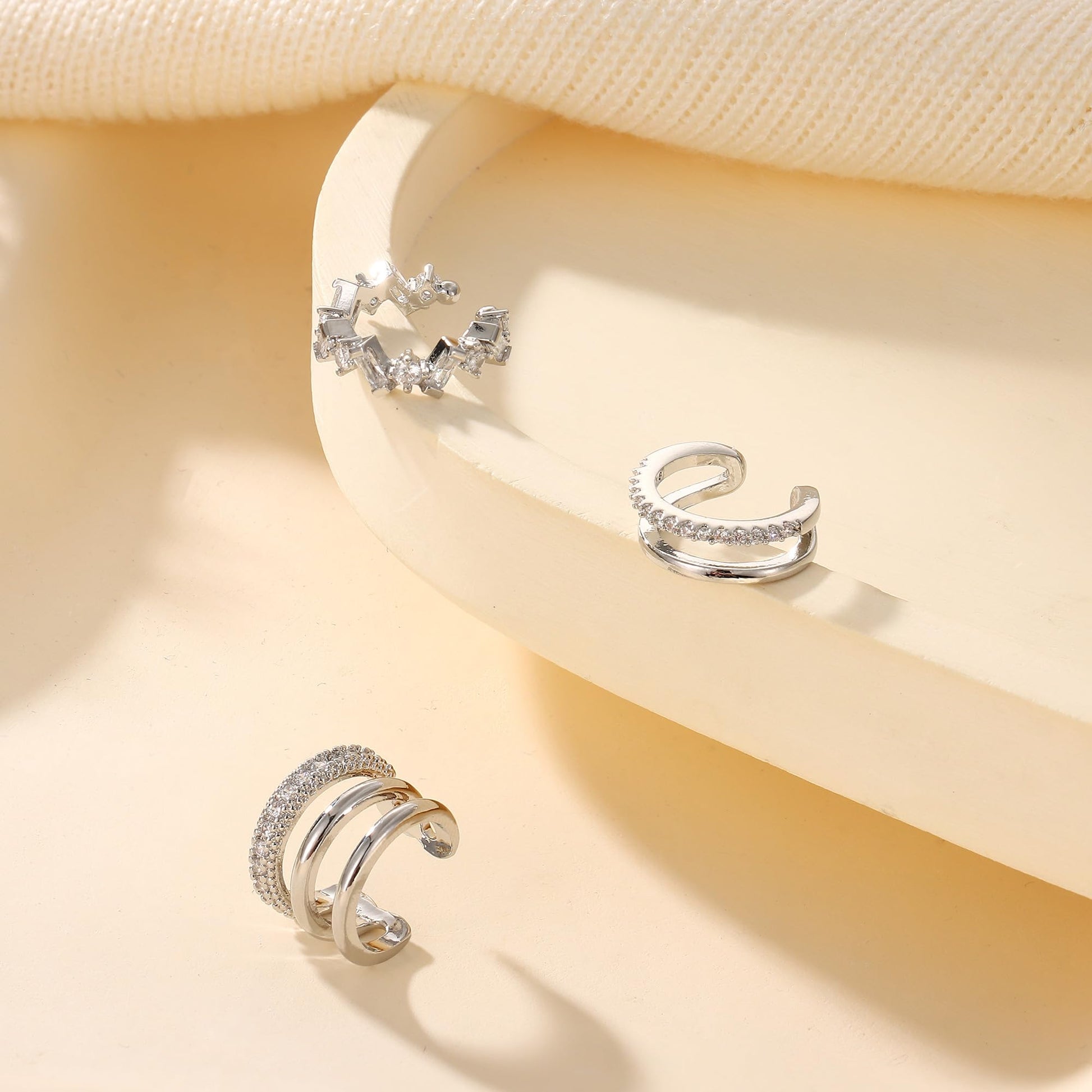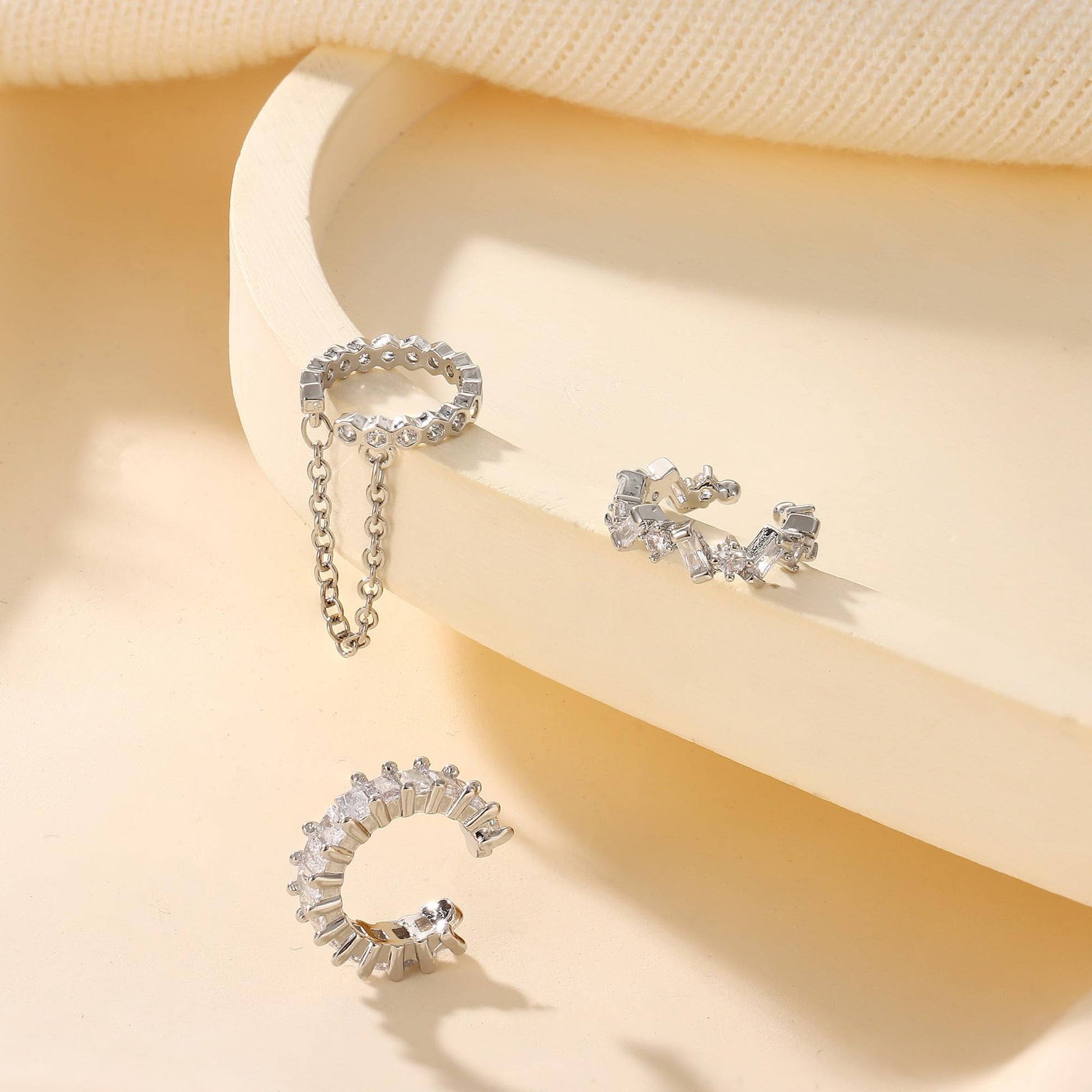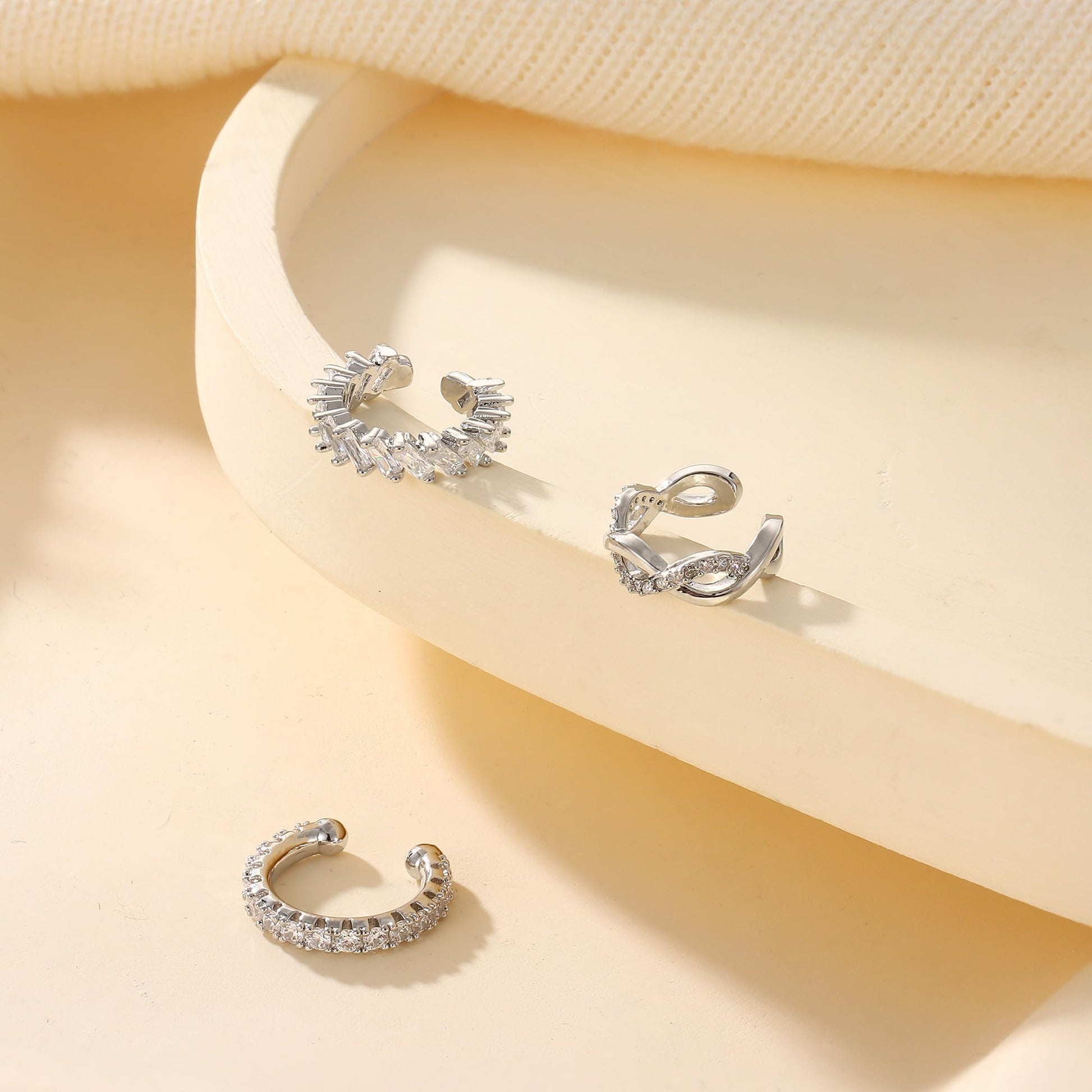 - DIFFERENT STYLES 💖There are 3 pairs different types of ear cuffs that you can choose to wear individually or stack together. The clip on earrings set with AAAAA+cubic zirconia, sparkling on the ears.