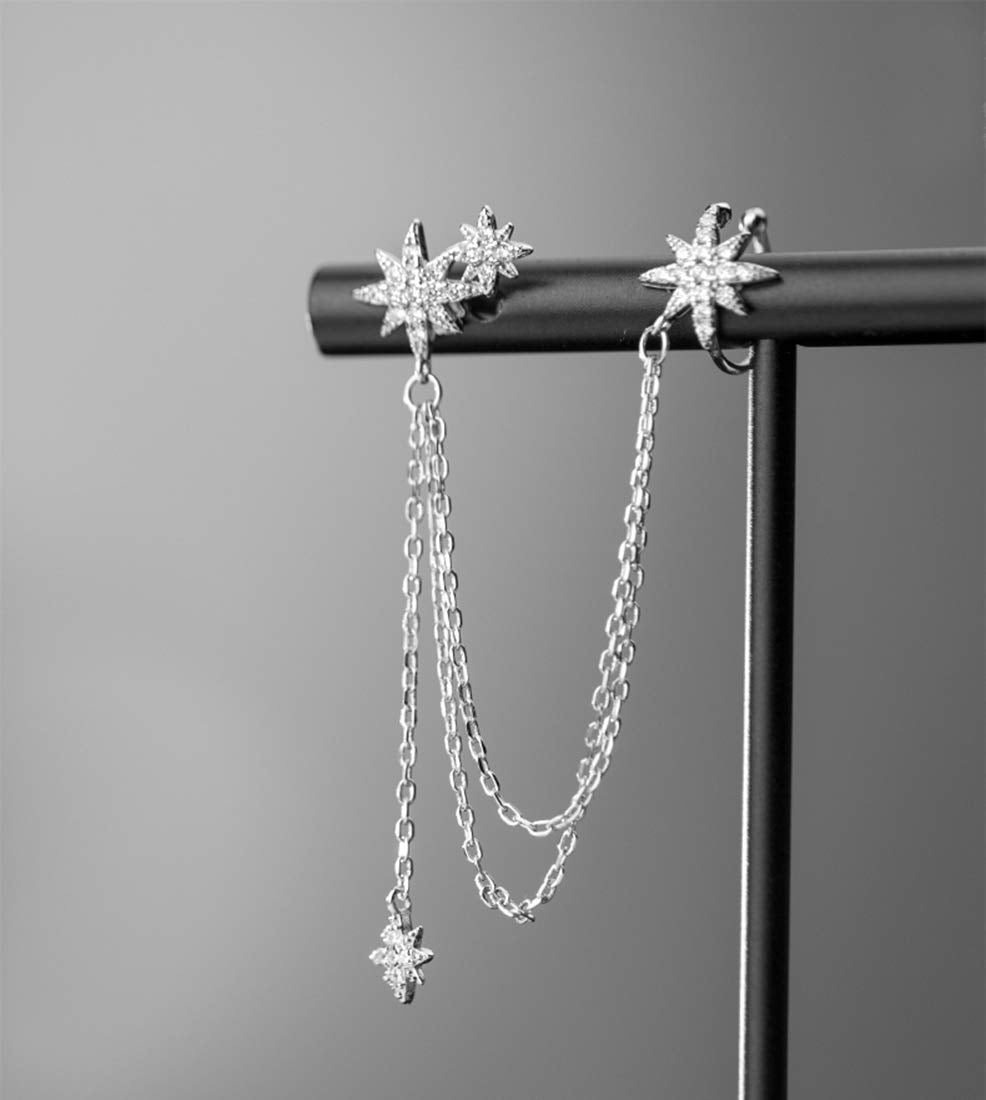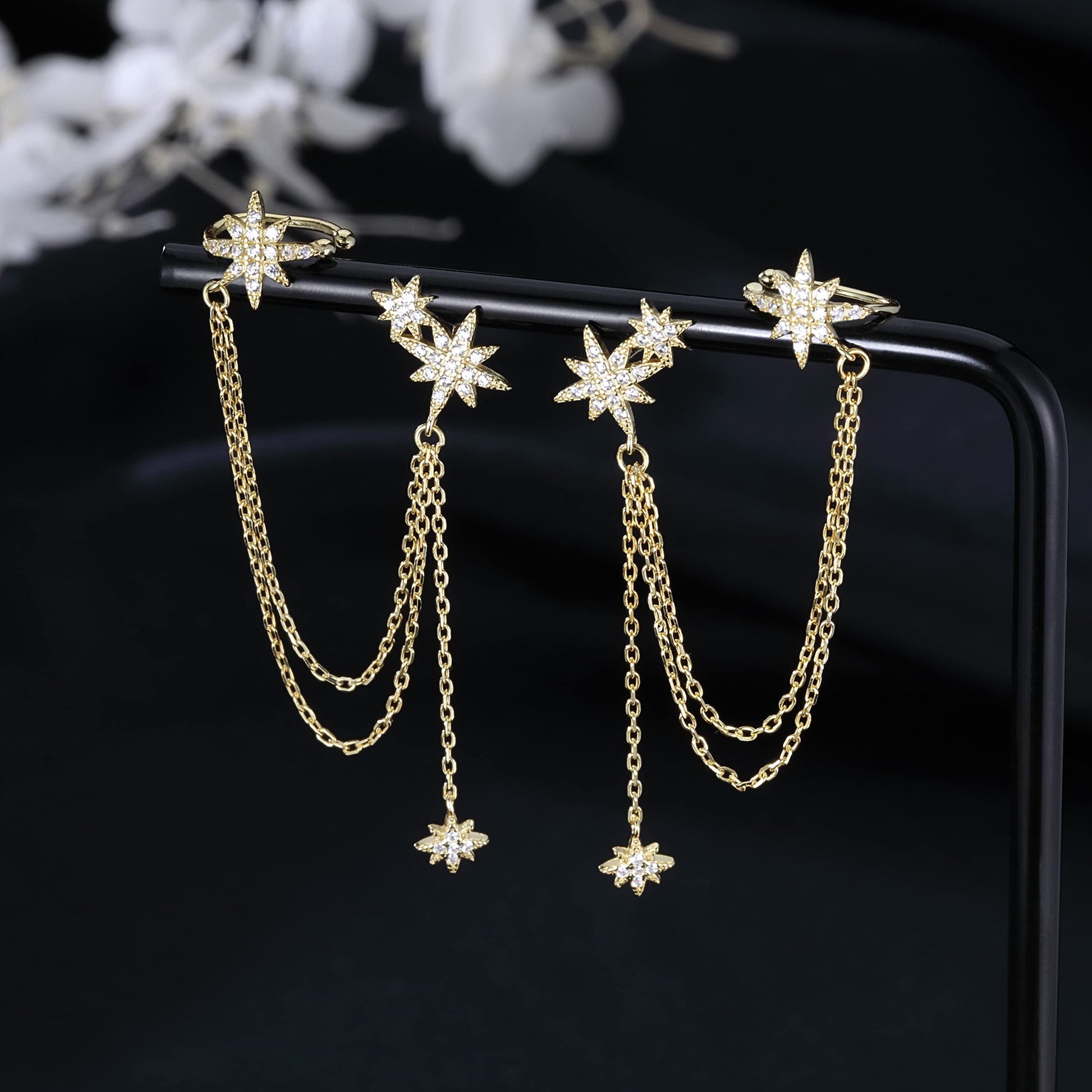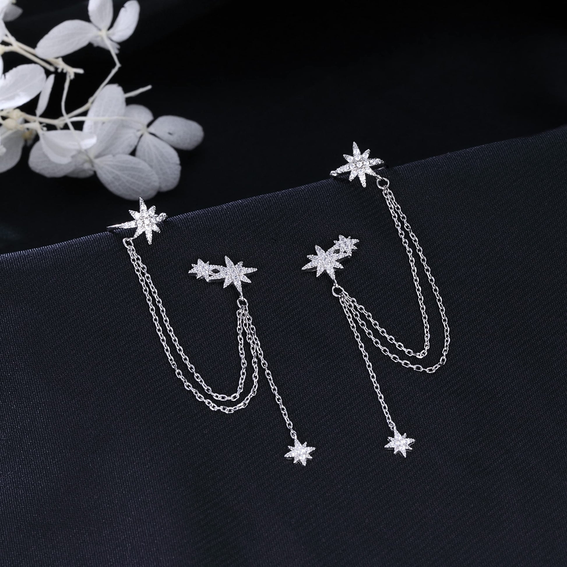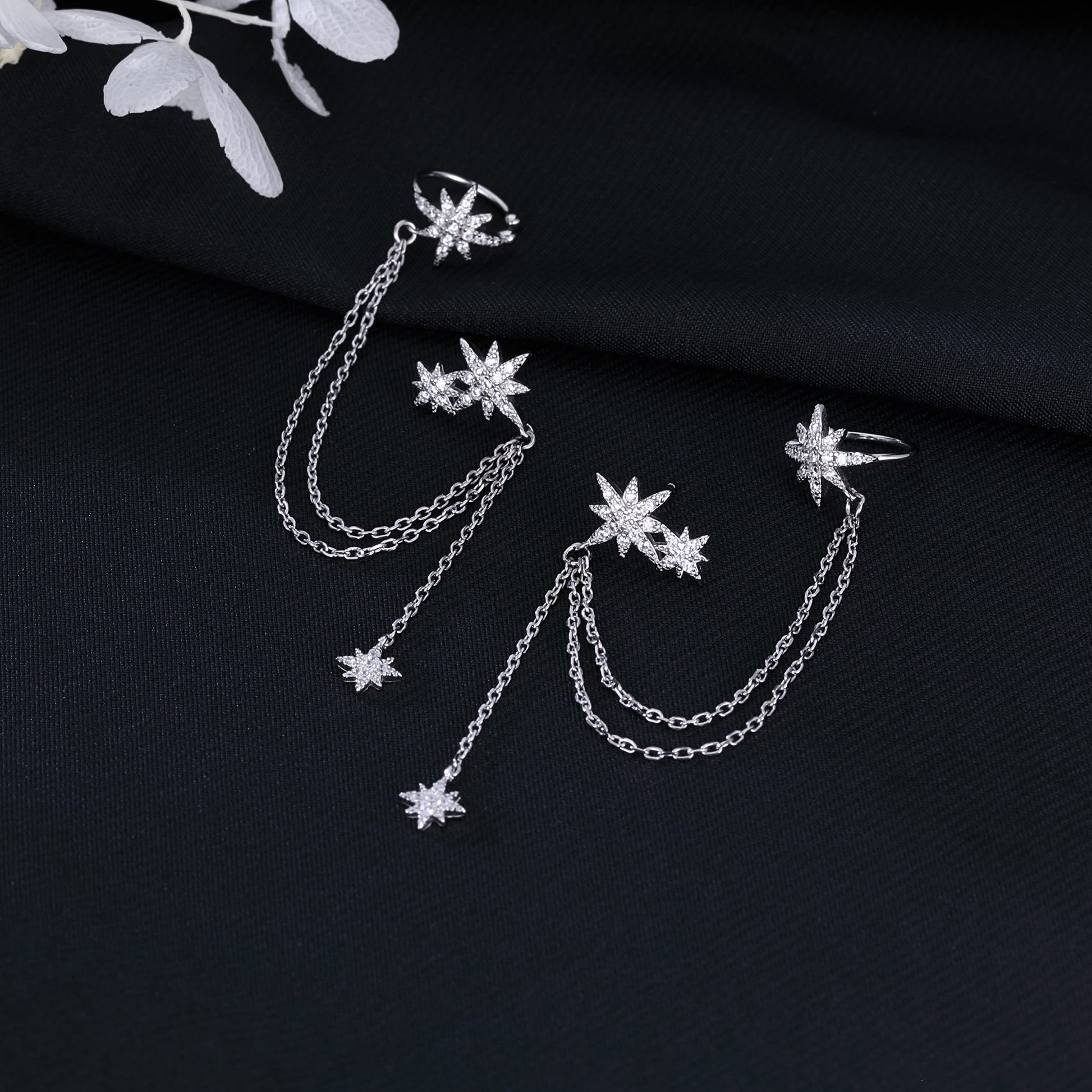 - SURFACE PLATING: The cuff sizes is 0.9cm(0.35''), the star earrings size is1.25cm*1.1cm(0.49''*0.43''), drop star earrings size is 0.6cm(0.24''), the dangle chain length is 3.8cm(1.5''), the whole earrings weight is 3.4g/pair, these cuff earrings all come with silver clean cloth in a pretty gift box stamped SLUYNZ.